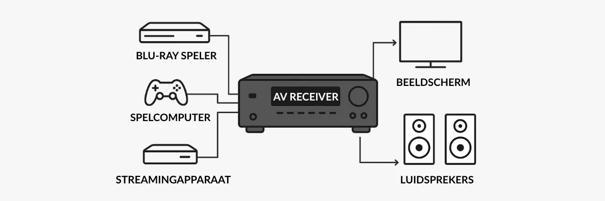 Signaalverwerking: De home cinema receiver verwerkt audiosignalen en stuurt ze naar de juiste speakers, inclusief een subwoofer voor de lage tonen.